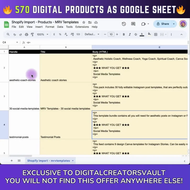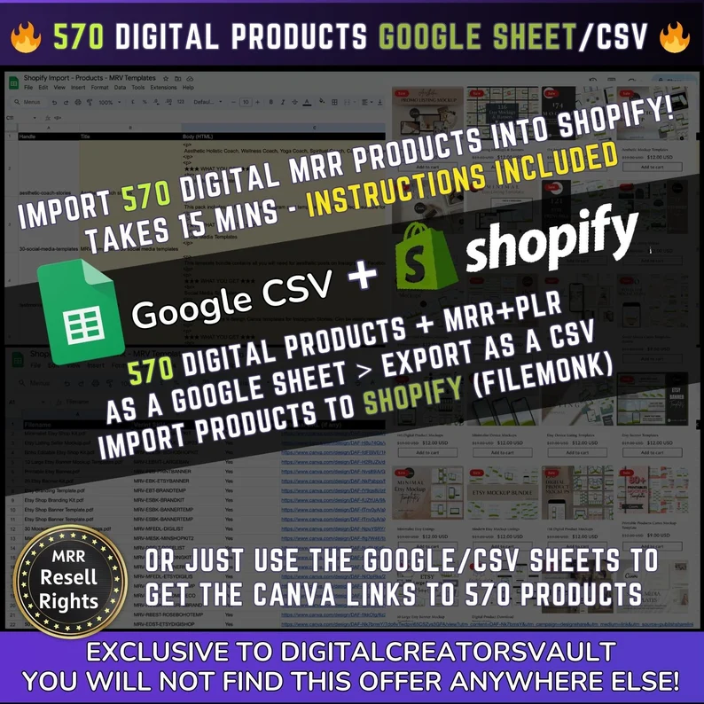 570 Digital Products Google Sheet CSV + Shopify Import files (with MRR+PLR)