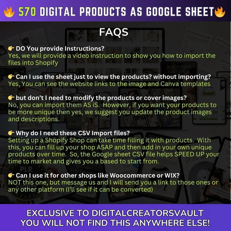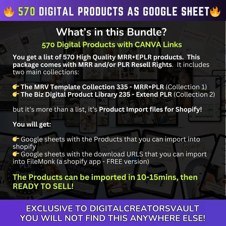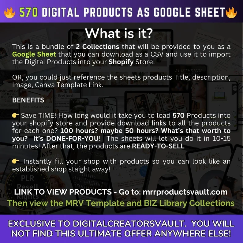570 Digital Products Google Sheet CSV + Shopify Import files – Commercial Use – Plus Master resell rights MRR + PLR for the Products