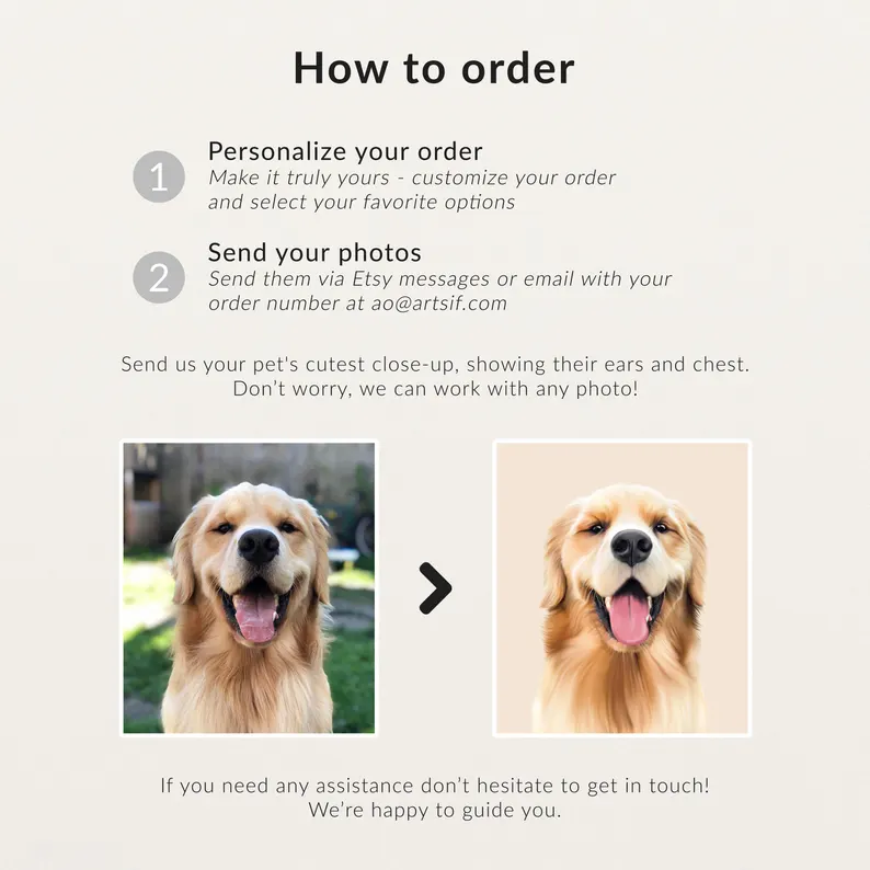 2. Send us the photos of your pet with Etsy Message box (Good quality and images and positions)
