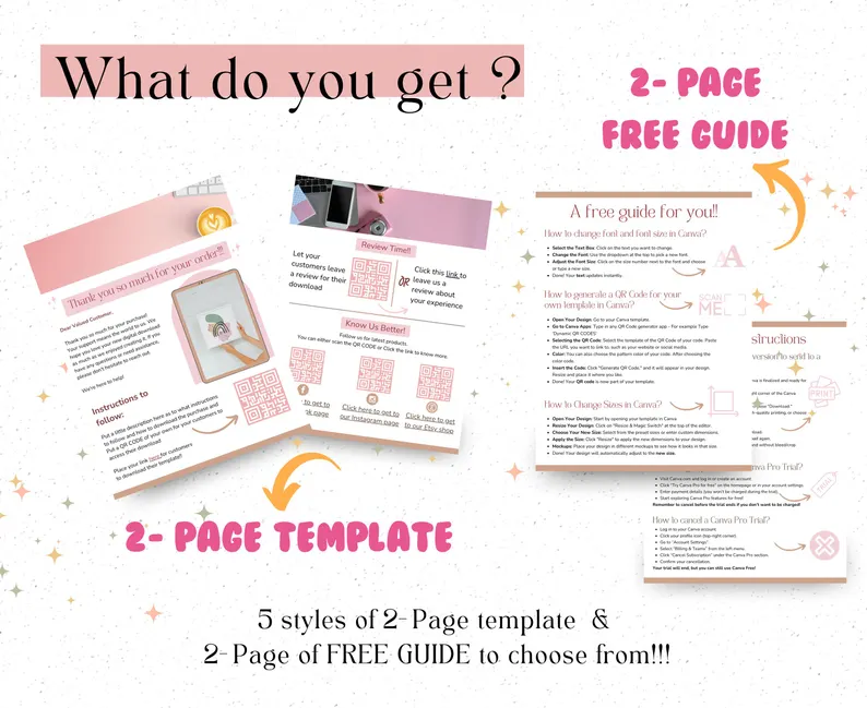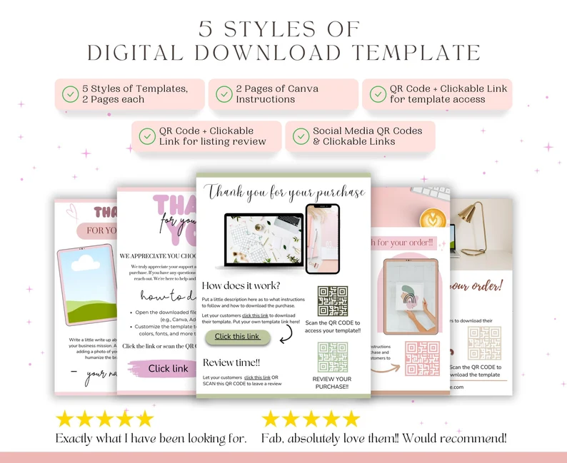Whether you’re saving your products to an online file storage platform like Google or Dropbox or sharing a Canva template link, simply add your hyperlinks to these templates, edit the design to match your product and brand, download as a standard PDF to maintain the links and upload to Etsy or your own shop – simple!